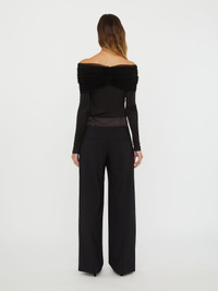 Evolved from the brands signature Veiled Top. This ribbed off the shoulder long sleeve top is wrapped in a sheath of transparent silk tulle. - Sheer stretch silk tulle - Lightweight ribbed base - Fold down shawl for multi wear - Off the shoulder - True to size - Main: 97% Viscose 3% Elastane - Outer Veil: 100% Silk Sarah is 175cm/5'8.5” & wears size AU 8 (US 4) AU sizing