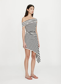 The Stripe Knit Extension Drape Mini Dress is crafted in a soft ribbed knit featuring monochrome stripes. Designed with an asymmetric hemline and an off-shoulder neckline that twists gently around the body, the silhouette drapes fluidly to create movement and ease. Style with minimal heels or layered over swimwear for versatile day-to-evening wear. - Off-shoulder neckline - Asymmetric hemline with side drape - Diagonal stripe placement for directional effect - Soft ribbed knit fabrication - Pull-on style - Main: 75% Cotton, 25% Nylon Model is 180cm/5'11" and wears size AU 8 (US 4) AU sizing