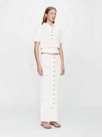 Shells delicately frame the body and embellish fine chalky knits. A maxi skirt is composed of a lightweight silk and linen blend rib structure that captures the eye as you move. - Wide rib structure - Maxi Silhouette - Sculptural spiral shell detailing - Lightweight fabrication - Main: 75% Cotton 25% Nylon - Hardware: Shell Trim Model is 180cm/5'11" and wears size AU 8 (US 4) AU sizing