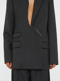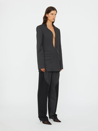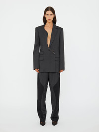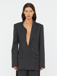 The Torrent Pinstripe Blazer cut in classic charcoal pinstripe wool with an asymmetric front closure that curves along the body. A single exposed zipper runs the length of the front, interrupting traditional suiting lines. Sharp shoulders and flap pockets anchor the silhouette with structured precision. - Asymmetric front closure with exposed zipper - Charcoal pinstripe wool tailoring - Sharp padded shoulders - Flap pockets detail - Fully lined - Main: 62% Polyester, 27% Viscose, 10% Virgin Wool, 1% Elastane - Lining: 100% Viscose - Dry Clean Only Model is 180cm/5'11" and wears size AU 8 (US 4) AU sizing