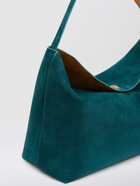 Constructed in a relaxed structure, this sculptural shoulder bag is crafted in rich tan suede shaped to a softened trapeze silhouette and anchored by a polished onyx toggle, suspended in a high-shine silver frame. Designed to rest under the arm or at the elbow, the minimal single-handle design opens to a spacious interior with a concealed magnetic closure. - Structured hobo-style bag in smooth suede - Custom oval stone clasp with natural stone - Tonal leather lining - Fixed top handle - Main: 100% Goat Suede - Hardware: 100% Brass