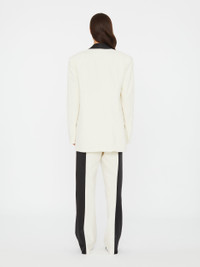 A tailored tuxedo blazer defined by a deep plunge and exaggerated satin shawl lapel. Cut with strong shoulders and a nipped waist, the silhouette is minimal yet assertive - balancing masculine structure with a refined sensuality. - Layer over tonal tailoring or pair with bare skin for evening impact. - Tailored blazer with exaggerated satin shawl lapel - Deep plunge front with internal hook fastening - Structured shoulders with light padding - Nipped waist with darted seams - Welt chest pocket detail - Fully lined - Main: 85% Polyester 15% Rayon - Contrast: 100% Silk - Lining: 100% Viscose - Dry Clean Only Model is 180cm/5'11" and wears size AU 8 (US 4) AU sizing