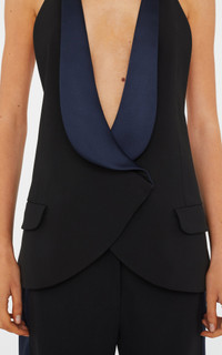 A backless halter vest reimagined through eveningwear codes. Cut in structured tailoring with an exaggerated satin shawl lapel, the curved front hem wraps cleanly across the body and fastens with minimal hardware at the neck and lower back. A balance of precision and exposed ease. Style over silk trousers or lace for evening contrast. - Tailored halter vest with open back - Contrast satin shawl lapel - Curved wrap front with plunge neckline - Hook and ring closures at neck and lower back - Flap pocket detailing at front - Fully lined - Main: 85% Polyester, 15% Rayon - Contrast: 96% Wool, 4% Elastane - Lining: 100% Viscose - Dry Clean Only Model is 180cm/5'11" and wears size AU 8 (US 4) AU sizing