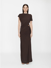 Crafted in stretch jersey, the asymmetric construction exposes the side waist in one continuous gesture, anchored by a soft gathered knot that defines the hip. Lightweight and easy to wear, it merges drape with skin-baring structure. - Floor-length gown in fluid jersey - Asymmetric cut-out detail at the waist - Soft knot detailing at the hip - Crew neckline and cap sleeves - Main: 100% Viscose Model is 180cm/5'11" and wears size AU 8 (US 4) AU sizing