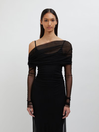 - 100% Silk - Sheer stretch fabric - Multi wear - Slip dress included - Off the shoulder silhouette - Full length hem - True to size - Dry clean only Lauren is 178cm/5'10.5” & wears size AU 8 (US 4) AU sizing