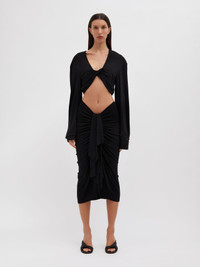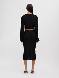 Nonchalant sensuality is explored through modern twist detailing. This midriff revealing cropped long sleeve is finished with emphasised drop shoulders. - Plunging neckline - Gathered detailing - Slim fit - Long sleeve silhouette - Invisible back zipper - True to size - 100% Viscose - Dry clean only Kate is 178cm/5'10” & wears size AU 8 (US 4) AU sizing