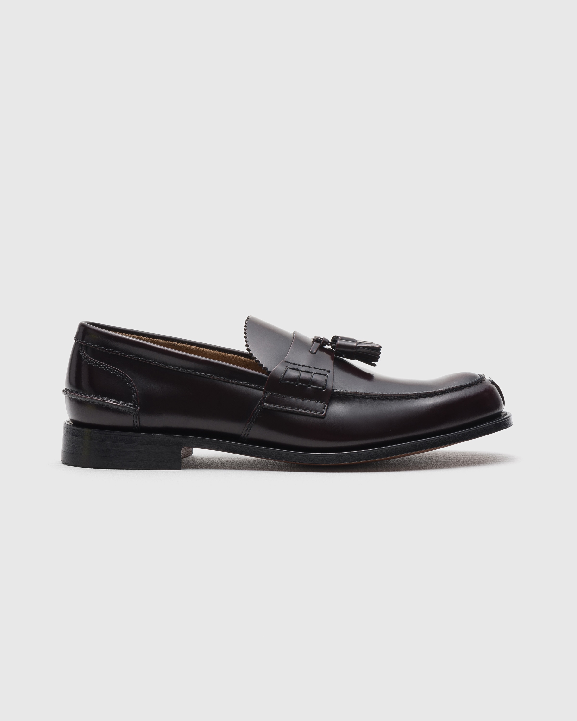Enriched with refined details such as tassels, this college-inspired penny loafer is a perfect blend of eclecticism and spontaneous appeal, an innovative design reminiscent of tradition. The fume finish enhances the bookbinder leather upper, showcasing all the elements emblematic of this style, such as hand-stitched seams and serrated edge tongue. A distinctive Church's style updated each season into new variations, the loafer stands as a true archetype of English style, originally evolving from the slippers created for King George VI. Crafted in Northampton, England, using the Goodyear method. • Product code: EDB028_9LG_F0ADY_F_000000 • College style loafer with hand-stitched details on the sides of the pan and on the tassels • Bookbinder leather upper with smoky finish • Unlined model for greater softness • Serrated tongue detail • Internal heel support • Folded topline for maximum comfort • Leather sole with Church's logo • Goodyear construction • Imported product