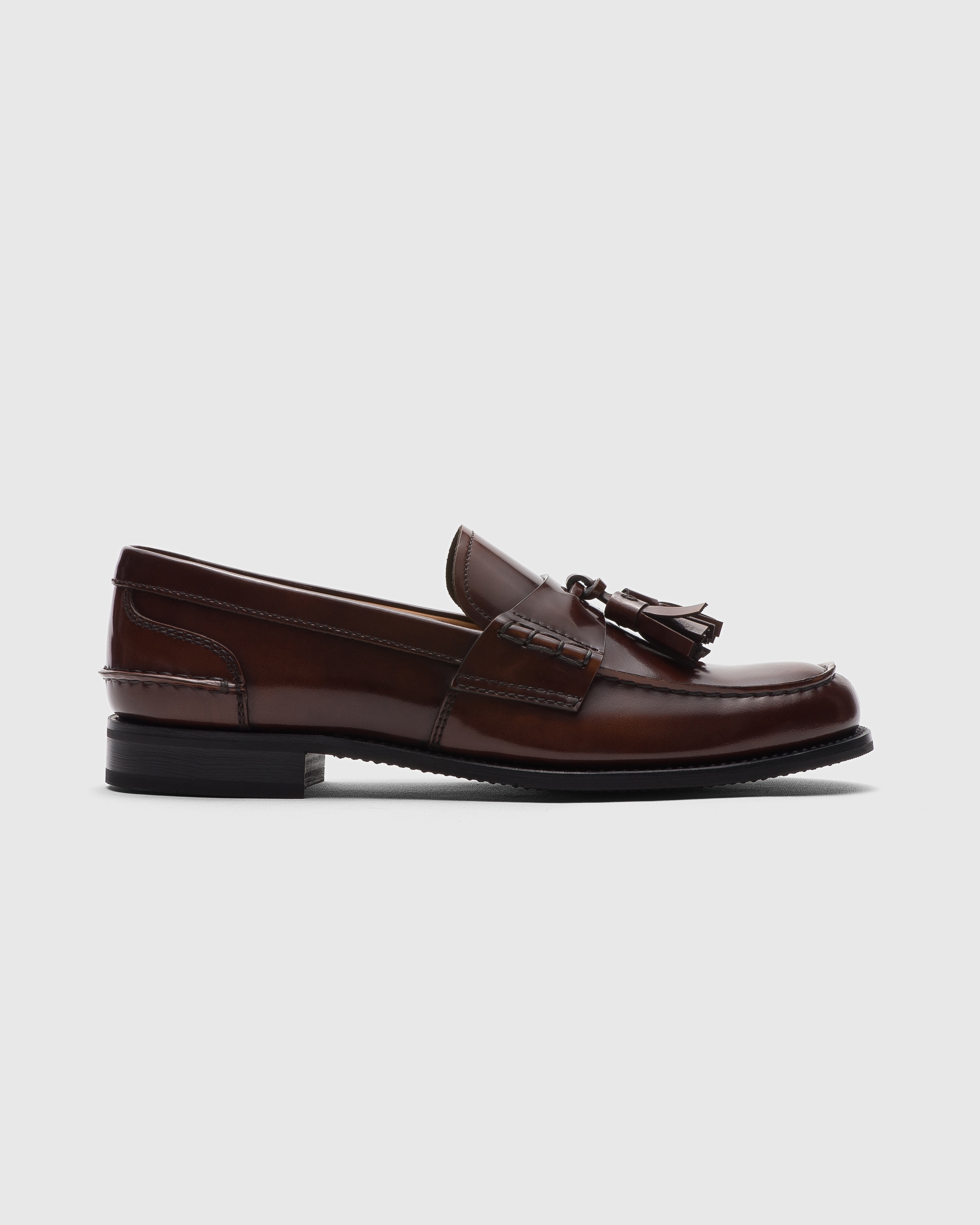 Enriched with refined details such as tassels, this college-inspired women's penny loafer is a perfect blend of eclecticism and spontaneous appeal. The fume finish enhances the brushed calfskin upper, showcasing all the elements emblematic of this style, such as hand-stitched seams and serrated edge tongue. A distinctive Church's style updated each season into new variations, the loafer stands as a true archetype of English style, originally evolving from the slippers created for King George VI. • Product code: DD0086_9EM_F0AEY • College loafer with pinch stitching on the apron • Hand-stitched strap with side stitching enriched with leather tassels • Shiny smoked brushed calfskin • Non-slip rubber sole • Blake construction • Church's logo on insole and sole • Imported product