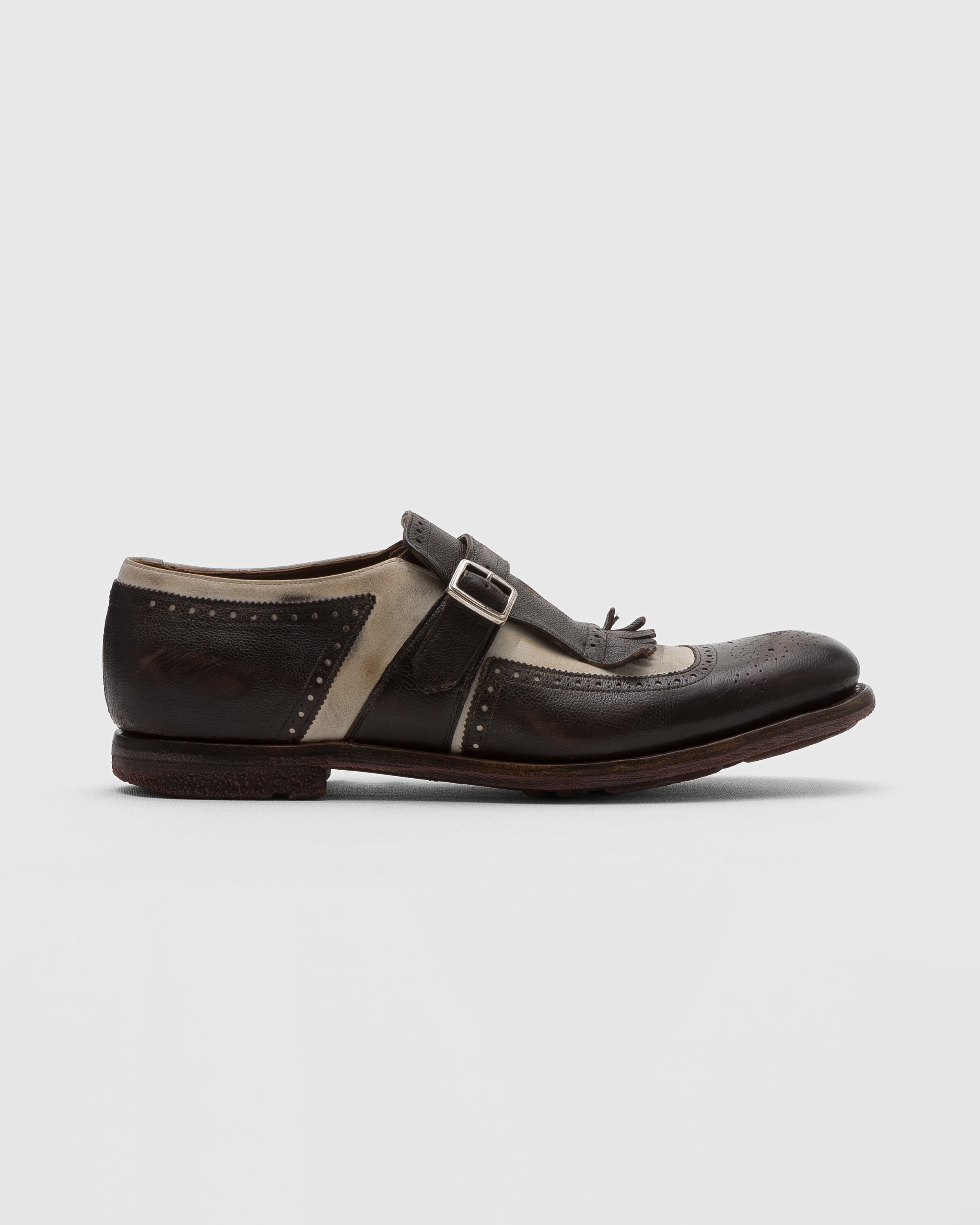 The iconic Shanghai, which was launched in 1929, is a style that redefined men’s footwear and continues to do so today. After an original copy of this historic shoe was found in our Northampton factory, we decided to re-issue it with an intentionally vintage look. Crafted with a raised toe spring, curled fringes, a buckled strap and full brogueing, this shoe presents traditional detailing. Church’s distressed glace treatment completes its eye-catching aesthetic with a glazed finish. • Product code: EOG001_9OM_F0ABS_F_000000 • Loafer with side buckle--- • Glace Calf and Nabuk with broguing--- • Silver-tone buckle and fringe detail--- • Raised toe spring--- • Vintage rubber sole with rivets--- • Internal lining for longevity of wear--- • Vintage Church’s label to lining--- • Church’s crest to distressed sock--- • Vintage logo to sole--- • We advise to purchase a half size smaller than your usual size • Imported product