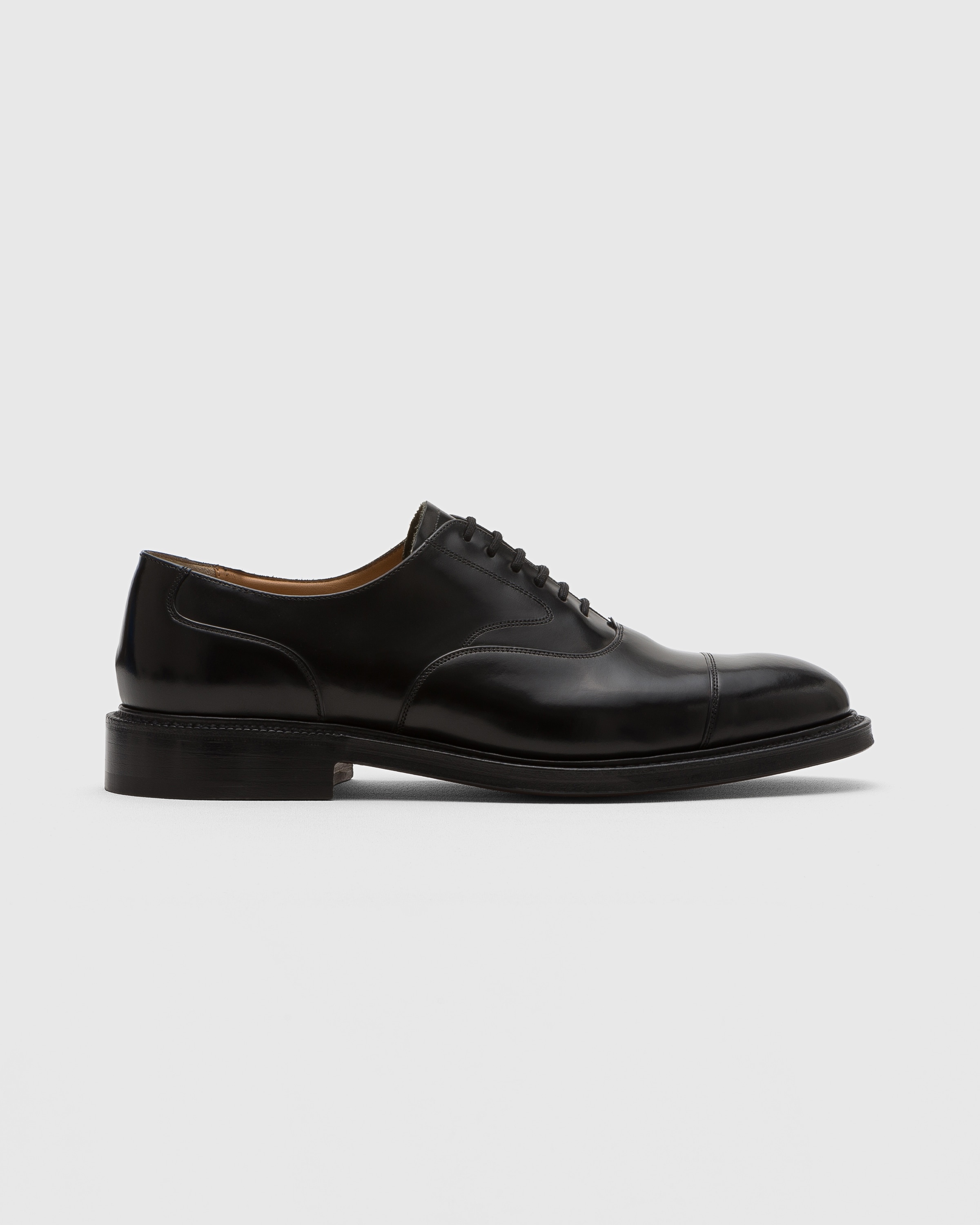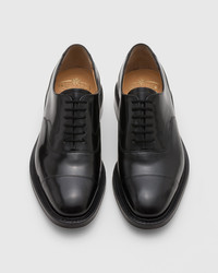 You’ll only find the Lancaster in black with a polished binder finish because, why mess with a classic? Since 1970 its sleek, sophisticated appearance has been defined by the delicacy of it’s decorations - subtle double stitching graces the toe cap and quarter lining while a high-shine polished binder finish is artfully achieved by buffing the grain and replacing it with pigment, gradually building depth of shading to enhance the natural beauty of the leather. Crafted on the 173 last, it’s traditional English aesthetic is further enhanced by it’s hardy storm welt and double sole construction, making the Lancaster a durable, water repellent shoe, perfect for the English weather!------Made in Northampton, England. • Product code: EEB010_9XV_F0AAB_F_000000 • Classic Lace-up oxford --- • Calf leather with polished binder finish--- • Cotton laces--- • Blind eyelets--- • Last 173--- • Leather double-sole--- • Internal lining for longevity of wear--- • Goodyear construction with storm welt--- • Handwritten shoe info to lining--- • Church’s crest to sock and sole • Imported product