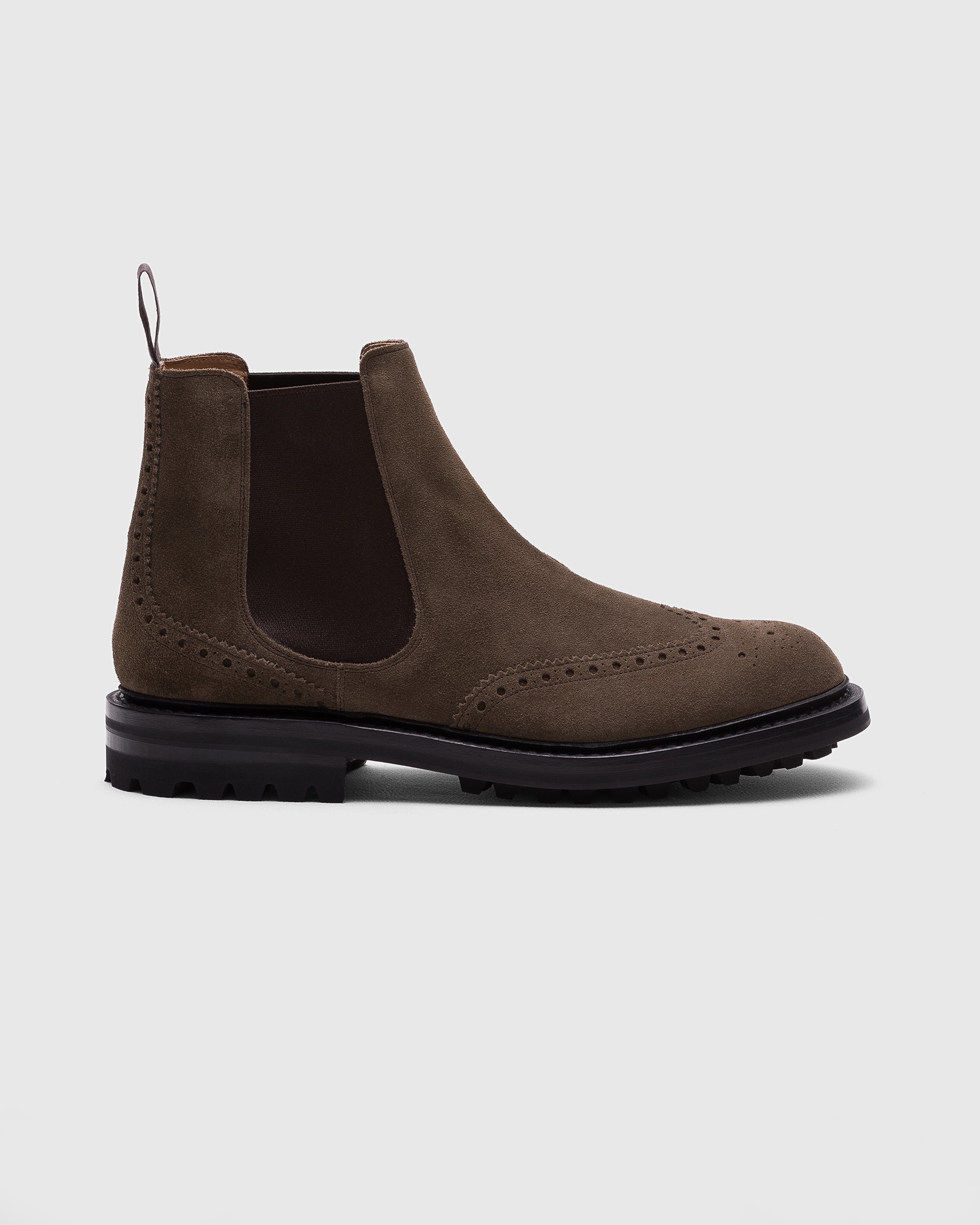 An intricate full brogue motif adds an elegant note to the McEntyre LW design, a classic Chelsea boot featuring functional and sporty details. The soft suede upper emphasises its refined yet casual charm, making it an ideal choice for leisure and professional settings, while the elasticated inserts, cotton pull-tab, and lightweight sole recall its equestrian origin. The internal lining and rugged sole with a storm welt guarantee grip, weather protection and durability. • Product code: ETC206_9VJ_F0AQY_F_000000 • Full brogue Chelsea boot with elasticated side insert • Suede leather • Back cotton pull-tab • Last 133 • Lightweight rubber sole • Internal lining for comfort and longevity of wear • Handwritten shoe info to lining • Goodyear construction with storm welt • Church's crest to sock and sole • Imported product