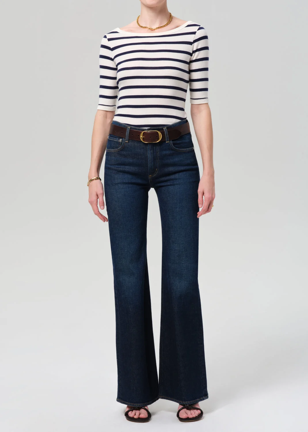 A refined take on a timeless essential, the 3/4 Sleeve Boat Neck Slim Tee features a classic cream and navy stripe for effortless, everyday wear. Crafted from a lightweight rib cotton blend, it offers a soft feel while holding its shape throughout the day. Designed with a flattering boat neckline and slim silhouette, this versatile piece transitions seamlessly from casual to polished styling—making it a foundational wardrobe staple. This fit is true to size. Looks Like: Cream and navy striped 3/4 sleeve shirt with boat neckline Feels Like: Lightweight rib cotton blend meant to hold its shape all day long From our HUMANITY Collection DETAILS Body Length: 21 1/2" Chest: 27 3/4" Sleeve Length: 12" Model is 5'10" and wearing a size Small Fabric Content: 90% Cotton 10% Polyester Care Instructions: Machine wash cold inside out with like colors. Do not bleach. Tumble dry low. Made in USA with imported materials 9499-1822_AZRST