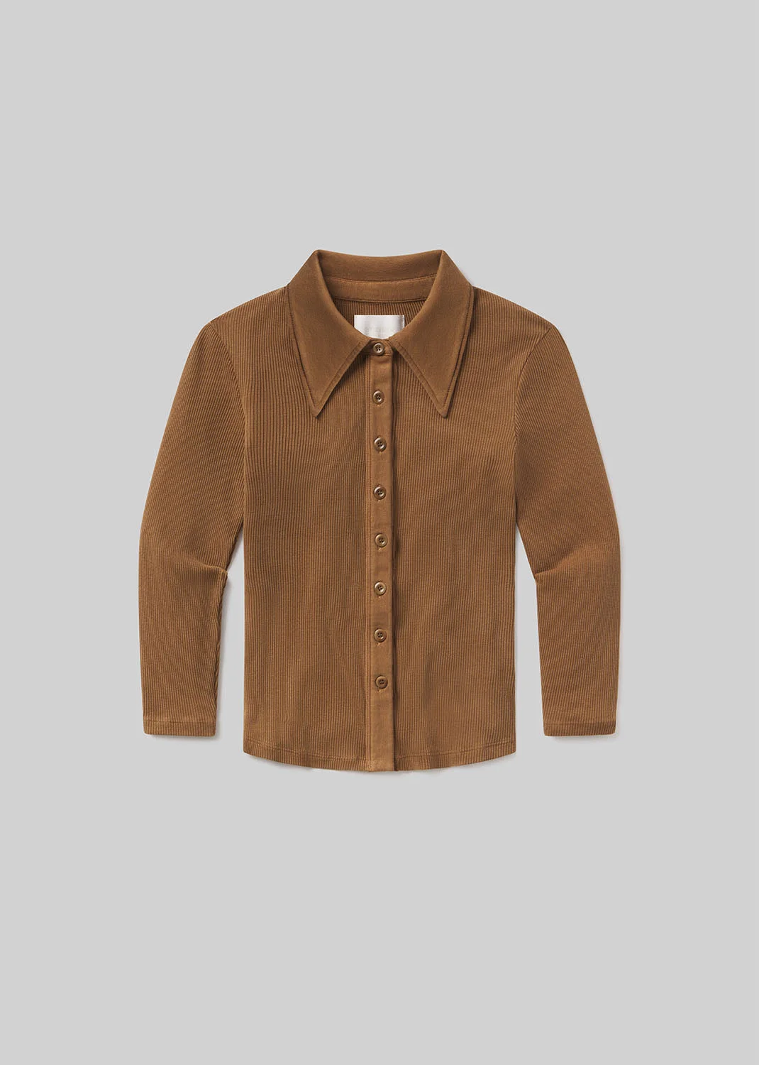 BLOOM, our FW '25 Capsule Collection in collaboration with Moda Operandi, is a celebration of regeneration, craft, and nature’s inherent wisdom. Rooted in the sustainable practices at Bloom Farm, this collection reflects our shared vision for innovative, responsible denim—an approach that begins in the soil and carries through to the pieces you wear every day. Designed for a figure-hugging fit with a neat polo collar. Cut in regeneratively grown cotton rib. This fit is true to size. Looks Like: Brown long sleeve fitted button up shirt with collar Feels Like: Ultra soft and supportive ribbed cotton This product is made with regenerative cotton from Citizens of Humanity Group’s Regenerative Cotton Program. Our program collaborates closely with farmers both domestically and internationally, nurturing growth, fostering education, and encouraging the widespread adoption of regenerative agricultural practices. DETAILS Body Length: 21 3/4" Chest: 28" Sleeve Length: 18" Model is 5'10" and wearing a size Small Fabric Content: 49% Regenerative Cotton 49% Tencel Lyocell 2% Spandex Care Instructions: Machine wash cold inside out with like colors. Do not bleach. Tumble dry low. Made in the USA 9465-3004_MNUKA