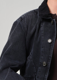 A modern take on classic workwear. The Abra Work Jacket, crafted in a washed black denim, channels timeless workwear aesthetics with thoughtful detailing. Made from 100% regenerative cotton, this jacket features functional pockets and a structured fit, blending practicality with polished style. Whether layered over casual pieces or worn as a standout statement, it’s a versatile addition to any wardrobe, designed to elevate both form and function. This fit is true to size. Argent and Citizens of Humanity reunite for Good Work: Collection Two a capsule that builds on the brands’ shared mission to shape a better future—one that is responsibly crafted and empowers women to look and feel their best. Built on a foundation of sustainable and regenerative materials, Collection Two reimagines tailored denim silhouettes in deep washes; rich seasonal shades of tobacco and cocoa, and a fresh approach to classic suiting, round out the assortment. Designed to move seamlessly from the workplace to life beyond, the capsule reinforces a modern uniform for all facets of life.. DETAILS Chest: 50 1/4" Body Length: 28" Sleeve Length: 23 1/2" Fabric: Shell: 100% Regenerative cotton Care Instructions: Machine wash cold inside out with like colors. Tumble dry low. Do not bleach. Made in USA with imported materials 5146-3007_MPOLI