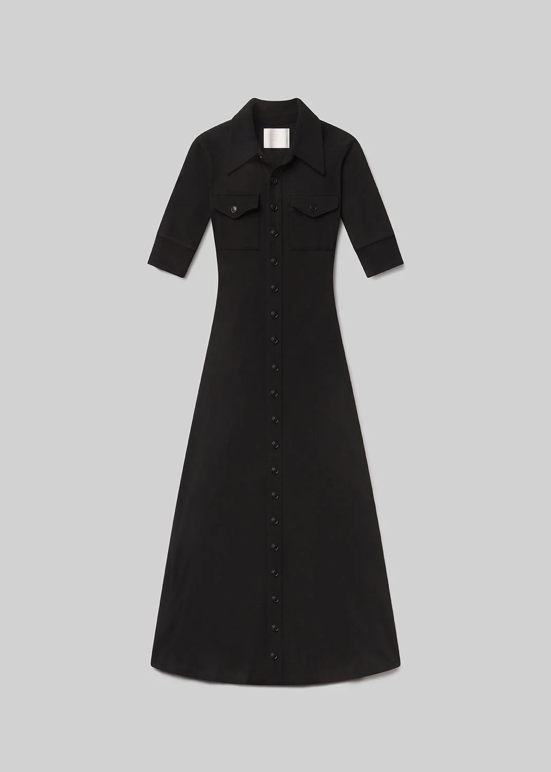 The ‘Amina’ dress is a modern take on the classic polo, cut in a softly structured rib with a button-down front and gently flared hem. Crafted from an ultra-soft, supportive blend of regenerative cotton and lyocell, it offers all-day comfort with a close fit through the bodice. In true black, it’s a polished essential—wear it solo with boots or layered over a slim turtleneck for cooler days. This fit is true to size. Looks Like: True black elbow sleeve below the knee polo dress Feels Like: Ultra soft and supportive ribbed cotton This product is made with regenerative cotton from Citizens of Humanity Group’s Regenerative Cotton Program. Our program collaborates closely with farmers both domestically and internationally, nurturing growth, fostering education, and encouraging the widespread adoption of regenerative agricultural practices. From our HUMANITY Collection DETAILS Body Length: 51" Chest: 29 3/4" Sweep: 86" Model is 5'10" and wearing a size Small Fabric Content: 49% Regenerative Cotton 49% Lyocell 2% Spandex Care Instructions: Machine wash cold inside out with like colors. Do not bleach. Tumble dry low. Made in USA with imported materials 455-3004_BLK