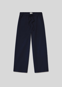 Crafted from a lightweight Italian twill, the ‘Aurora’ pant features a soft cotton with natural drape and breathability. The high-rise drawstring waist and wide leg create a relaxed yet refined silhouette. In deep ‘True Navy,’ it’s an effortless alternative to black—perfect with tonal layers or crisp shirting. This fit is true to size. Looks Like: Deep dark navy pull on pant with drawstring at the waistband Feels Like: An airy yet soft flax and cotton blend with the right amount of drape From our HUMANITY Collection DETAILS Rise: 13" Inseam: 29 1/2" Leg Opening: 22" Model is 5'10" and wearing a size Small Fabric Content: 79% Cotton 21% Flax Care Instructions: Machine wash cold inside out with like colors. Do not bleach. Tumble dry low. Made in USA with imported materials 2186-1506_TNAVY