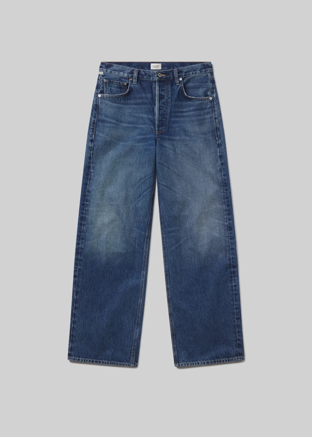 The ‘Ayla’ jean offers a refined take on the baggy silhouette with a relaxed fit that sits away from the body while maintaining a clean, intentional shape. The ‘Claremont’ wash is a medium indigo with soft fading, marbling, and subtle whiskering for a broken-in feel. Crafted from rigid regenerative cotton with a soft hand, it’s an easy staple that styles effortlessly with everything from crisp shirting to slim knits. This style is true to size and intended to sit relaxed at the natural waist. For a higher and closer fit, we recommend sizing down. Looks Like: Medium indigo denim pant Feels Like: Rigid, non-stretch cotton denim with a soft hand for all day wearability This product is made with regenerative cotton from Citizens of Humanity Group’s Regenerative Cotton Program. Our program collaborates closely with farmers both domestically and internationally, nurturing growth, fostering education, and encouraging the widespread adoption of regenerative agricultural practices. From our HUMANITY Collection DETAILS Closure: Button Fly Rise: 12 3/8" Inseam: 32" Leg Opening: 20 1/2" Model is 5'10" and wearing a size 27 Fabric Content: 100% Regenerative Cotton Care Instructions: Machine wash cold inside out with like colors. Do not bleach. Tumble dry low. Made in Turkey with imported materials 2053-3017_CLMNT