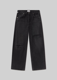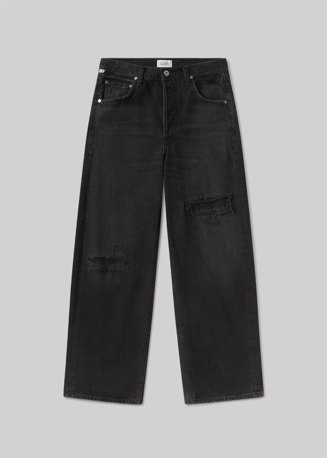 The Ayla jean offers a refined take on the baggy silhouette with a relaxed fit that sits away from the body while maintaining a clean, intentional shape. Vernatta is a dark, washed-out black with fading, whiskering. Crafted from rigid regenerative cotton with a soft hand, it styles effortlessly with everything from crisp shirting to slim knits. This fit is true to size. Looks Like: Dark washed out black denim pant with destruction at the knee and thigh Feels Like: Rigid, non-stretch cotton denim with a soft hand for all day wearability This product is made with regenerative cotton from Citizens of Humanity Group’s Regenerative Cotton Program. Our program collaborates closely with farmers both domestically and internationally, nurturing growth, fostering education, and encouraging the widespread adoption of regenerative agricultural practices. From our HUMANITY Collection DETAILS Closure: Button Fly Rise: 12 3/4" Inseam: 32" Leg Opening: 21" Model is 5'10" and wearing a size 27 Fabric Content: 100% Regenerative Cotton Care Instructions: Machine wash cold inside out with like colors. Do not bleach. Tumble dry low. Made in Turkey with imported materials 2053C-3062_VRNAT