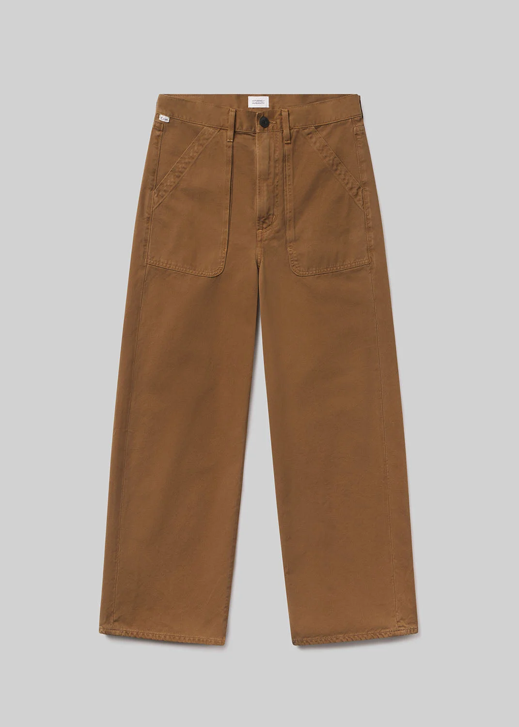 The ‘Ayla Cargo’ reimagines the baggy silhouette with utilitarian pocketing and structured ease. Style with pared-back knits or tonal layers for a modern, utilitarian look. This fit is true to size. Looks Like: Dark copper cargo pant with utility pockets Feels Like: Durable rigid, non-stretch supima twill made to hold its shape This product is made with regenerative cotton from Citizens of Humanity Group’s Regenerative Cotton Program. Our program collaborates closely with farmers both domestically and internationally, nurturing growth, fostering education, and encouraging the widespread adoption of regenerative agricultural practices. From our HUMANITY Collection DETAILS Closure: Zip Fly Rise: 12 1/4" Inseam: 30" Leg Opening: 22" Model is 5'10" and wearing a size 27 Fabric Content: 100% Regenerative cotton Care Instructions: Machine wash cold inside out with like colors. Do not bleach. Tumble dry low. Made in Turkey with imported materials 2185-3055_BRNZE