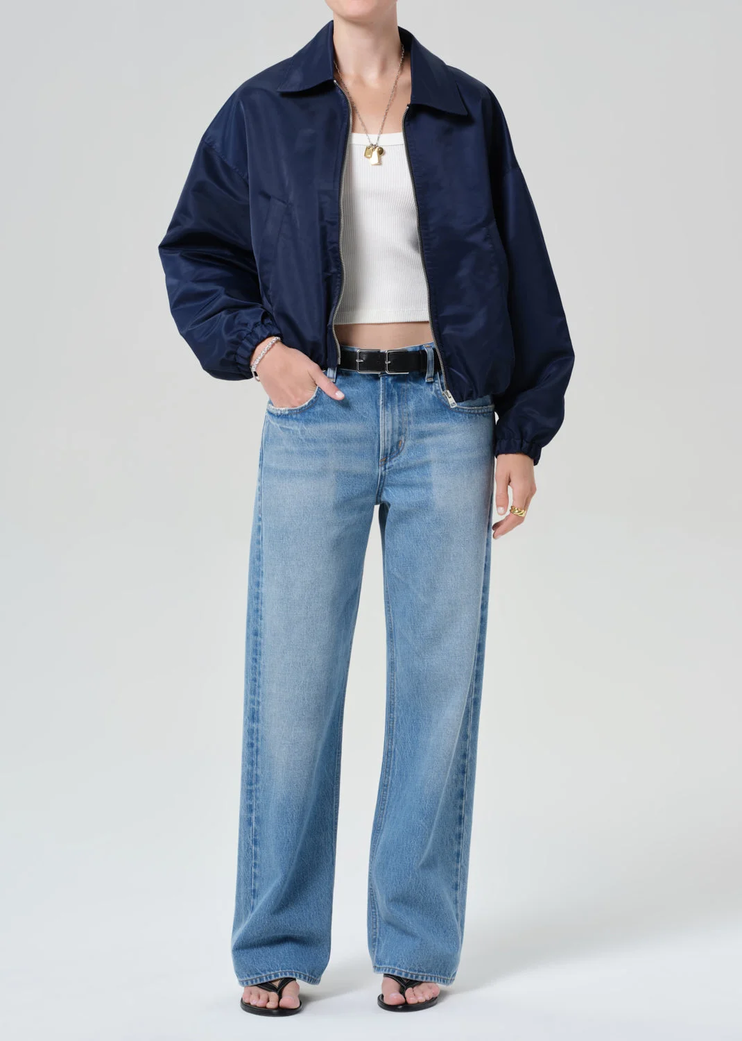 A refined interpretation of the timeless bomber, the Bubble Bomber is crafted from lightweight, breathable nylon with a polished finish. Designed with a pointed collar, clean lines, and an elastic hem, it balances modern ease with nostalgic appeal. The classic navy hue makes it the perfect layer over a tee or paired with tonal denim for understated sophistication. This fit is true to size. Looks Like: Classic navy nylon bomber jacket with elastic at the hem Feels Like: Smooth, cool to the touch lightweight breathable nylon From our HUMANITY Collection DETAILS Model is 5'10" and wearing a size Small Fabric Content: 100% Nylon Care Instructions: Dry clean only. Made in Vietnam with imported materials 5174B_NAVY