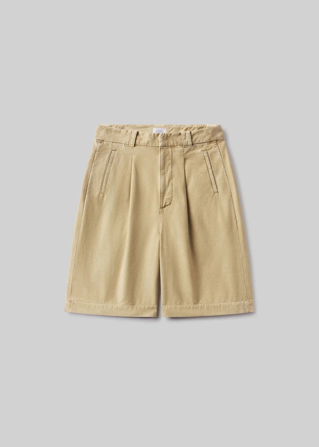 The Cara Pleated Short hits at the knee, offering a refined yet relaxed silhouette. Crafted from luxe, lightweight twill, its expertly placed pleats add subtle volume and structure. Pair it with a fitted tank for a sleek look or an oversized button-down for effortless sophistication. This fit is true to size. Looks Like: Medium beige short with front pleat detailing and trouser pockets Feels Like: Midweight rigid, non stretch twill made to hold its shape all day long From our HUMANITY Collection DETAILS Closure: Zip Fly Rise: 13" Inseam: 8 1/2" Leg Opening: 25 1/2" Model is 5'10 and wearing a size 27 Fabric Content: 100% Regenerative Cotton Care Instructions: Machine wash cold inside out with like colors. Do not bleach. Tumble dry low. Made in Turkey with imported materials 2194-576_GOBI