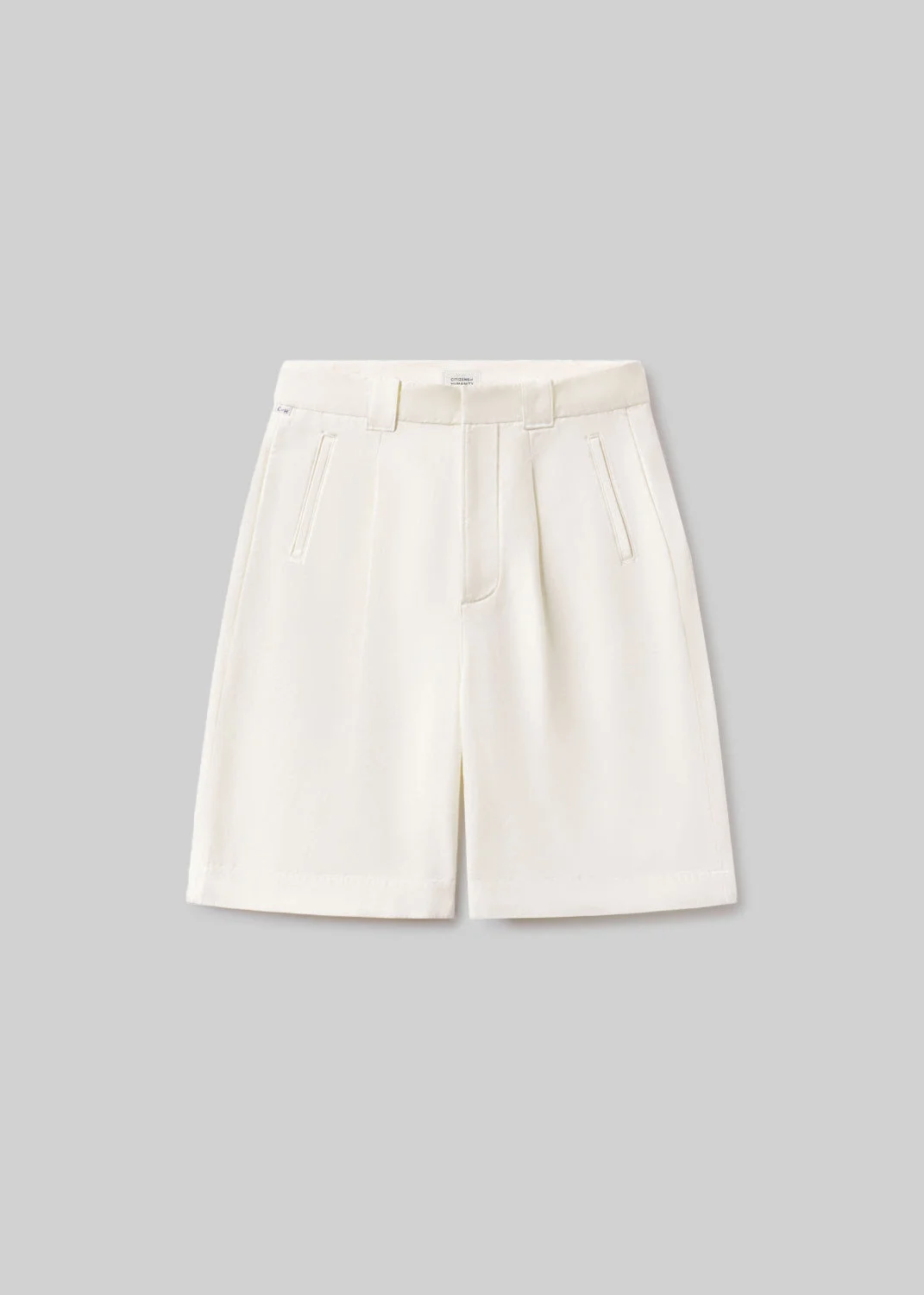 The Cara Pleated Short hits at the knee, offering a refined yet relaxed silhouette. Crafted from luxe, lightweight twill, its expertly placed pleats add subtle volume and structure. Pair it with a fitted tank for a sleek look or an oversized button-down for effortless sophistication. This fit is true to size. Looks Like: Off white cream short with front pleat detailing and trouser pockets Feels Like: Midweight rigid, non stretch twill made to hold its shape all day long From our HUMANITY Collection DETAILS Closure: Zip Fly Rise: 13" Inseam: 8 1/2" Leg Opening: 25 1/2" Model is 5'10 and wearing a size 27 Fabric Content: 100% Regenerative Cotton Care Instructions: Machine wash cold inside out with like colors. Do not bleach. Tumble dry low. Made in Turkey with imported materials 2194-576_PMINA