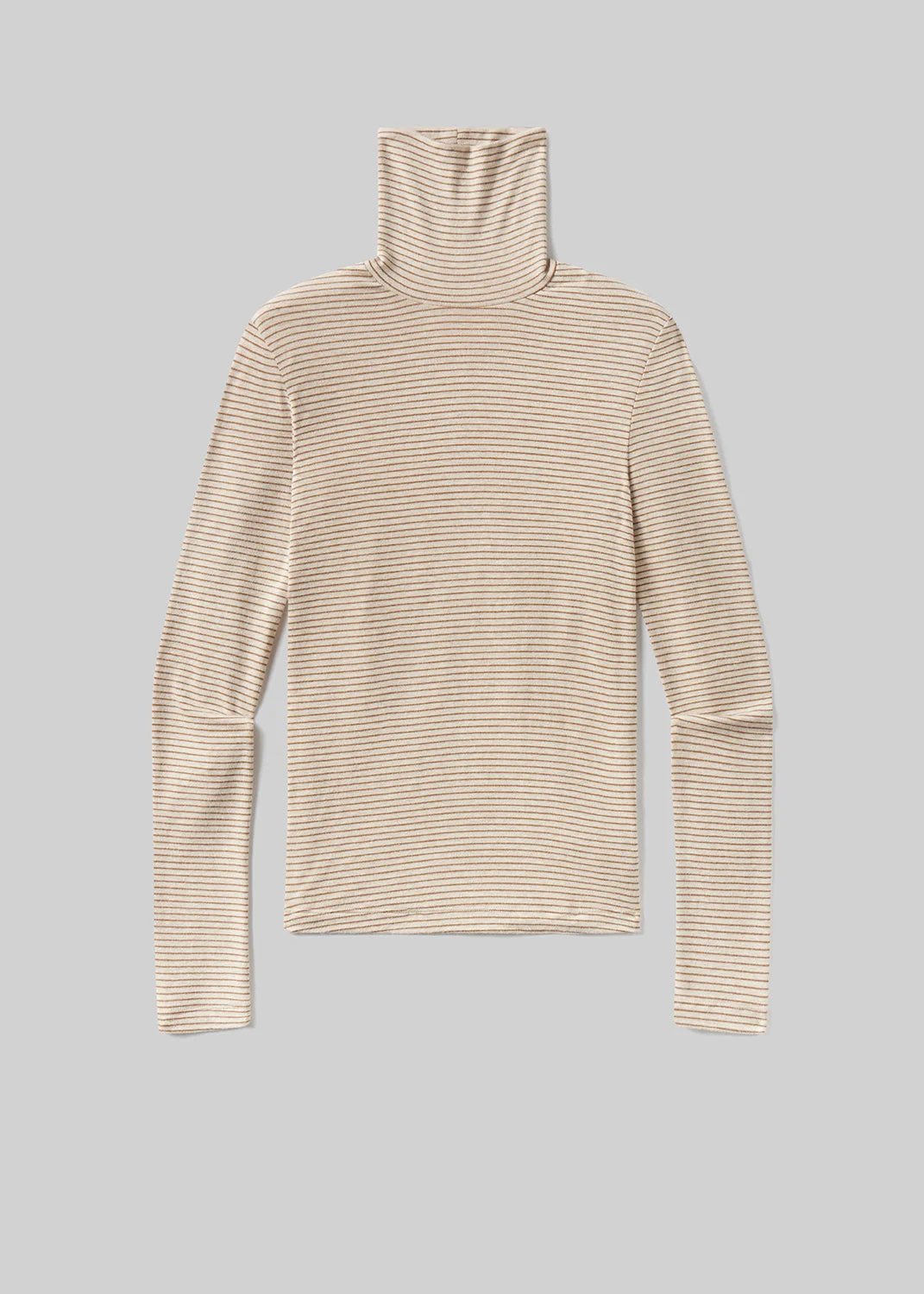 A refined foundation piece, the Caradene Turtleneck is crafted from super-soft sweater rib with just the right amount of stretch. The slim silhouette offers a clean, polished look—ideal layered under tailoring or worn solo with denim. This fit is true to size. Looks Like: Beige and brown striped long sleeve turtleneck shirt Feels Like: Super soft fine jersey cotton blend that is breathable with the perfect amount of stretch From our HUMANITY Collection DETAILS Body Length: 23" Chest: 26" Model is 5'10" and wearing a size Small Fabric Content: 75% Rayon 10% Recycled Cotton 10% Recycled Polyester 5% Spandex Care Instructions: Machine wash cold inside out with like colors. Do not bleach. Tumble dry low. Made in USA with imported materials 9407-1862_COSTR