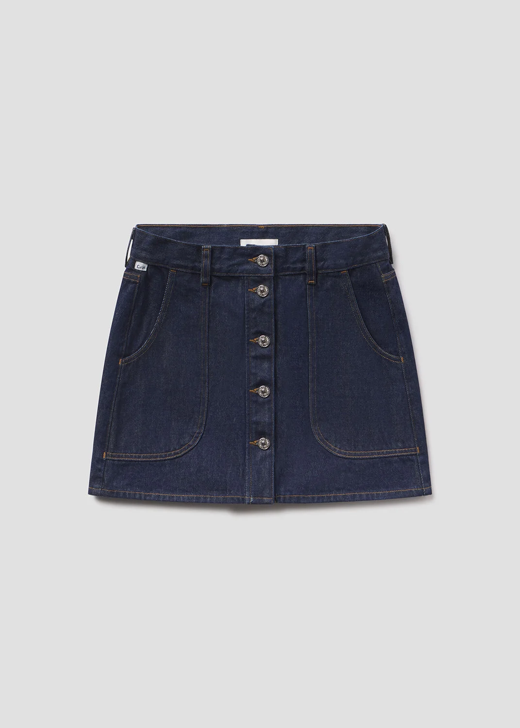 The ‘Curved Pocket’ mini skirt is a modern wardrobe staple, cut from rigid regenerative cotton denim with a soft, broken-in hand. Designed with front buttons and sculptural curved pockets, it offers structure with subtle ease. The dark Amherst wash is clean and versatile—ideal styled with a crisp shirt or oversized knit. This fit is true to size. Looks Like: Clean dark rinsed out indigo denim mini skirt with curved pockets and button front closure Feels Like: Rigid, non-stretch cotton denim with a soft hand for all day wearability This product is made with regenerative cotton from Citizens of Humanity Group’s Regenerative Cotton Program. Our program collaborates closely with farmers both domestically and internationally, nurturing growth, fostering education, and encouraging the widespread adoption of regenerative agricultural practices. Eco-Indigo is a first-of-its-kind, high-performance textile dye. It transforms renewable resources like sugar through fermentation and green chemistry to create vibrant, lasting COLOR. This groundbreaking process reduces energy consumption, CO₂ emissions, and dependence on fossil fuels, thus help preserving our environment. Now applied to our regenerative cotton denim, Eco-Indigo is coloring the way for a more sustainable future. From our HUMANITY Collection DETAILS Closure: Button Fly Sweep: 42 3/4" Model is 5'10" and wearing a size 27 Fabric Content: 100% Regenerative Cotton Care Instructions: Machine wash cold. Made in USA with imported materials 3196-1810_AMHER