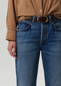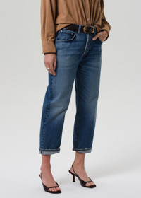 The ‘Dahlia Baby Roll’ is a relaxed tapered jean crafted from rigid regenerative cotton denim with a soft, broken-in feel. Designed with a button fly and optional cuff, the silhouette feels easy yet intentional. The Chaya wash—a sun-faded indigo with marbling and whiskering—adds a worn-in, vintage-inspired edge. Style it cuffed with sandals or left long with classic loafers. This fit is true to size. Looks Like: Medium to light indigo denim pant with optional cuff Feels Like: Rigid, non-stretch cotton denim with a soft hand for all day wearability This product is made with regenerative cotton from Citizens of Humanity Group’s Regenerative Cotton Program. Our program collaborates closely with farmers both domestically and internationally, nurturing growth, fostering education, and encouraging the widespread adoption of regenerative agricultural practices. Eco-Indigo is a first-of-its-kind, high-performance textile dye. It transforms renewable resources like sugar through fermentation and green chemistry to create vibrant, lasting COLOR. This groundbreaking process reduces energy consumption, CO₂ emissions, and dependence on fossil fuels, thus help preserving our environment. Now applied to our regenerative cotton denim, Eco-Indigo is coloring the way for a more sustainable future. From our HUMANITY Collection DETAILS Closure: Button Fly Rise: 11 7/8" Inseam: 25 1/2" Leg Opening: 15 3/4" Model is 5'10" and wearing a size 27 Fabric Content: 100% Regenerative Cotton Care Instructions: Machine wash cold inside out with like colors. Do not bleach. Tumble dry low. Made in Turkey with imported materials 2119-1810_CHAYA