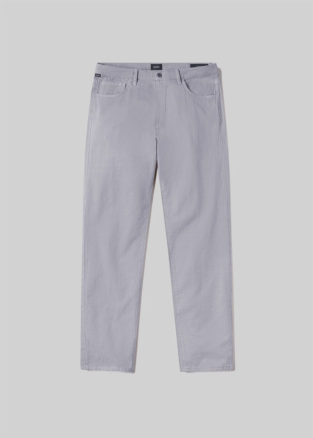 Our most relaxed fit, offering a straight fit throughout the hip and leg. If you loved our Sid or Perfect Casual Straight Fit, you will love the Elijah. This fit is true to size. Looks Like: Light pale blue grey Feels Like: Midweight stretch linen From our HUMANITY Collection DETAILS Closure: Zip Fly Rise: 10 3/4” Inseam: 32” Leg Opening: 16 1/4” Model is 6'1" and is wearing a Size 31 Fabric Content: 67% Cotton 32% Linen 1% Elastane Care Instructions: Machine wash cold inside out with like colors. Do not bleach. Tumble dry low. Made in USA with imported materials 6510B-1762_HEMA