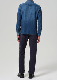 The Elijah is our most relaxed fit, designed with a straight cut through the hip and leg for effortless comfort and refined style. Crafted from a stretch linen blend, it offers subtle flexibility and a naturally elevated texture. Finished in our signature five-pocket silhouette, this style delivers a sophisticated balance of ease, structure, and timeless appeal. If you loved our Sid or Perfect Casual Straight Fit, you will love the Elijah. This fit is true to size. Looks Like: Deep midnight navy Feels Like: Midweight stretch linen From our HUMANITY Collection DETAILS Closure: Zip Fly Rise: 10 3/4” Inseam: 32” Leg Opening: 16 1/4” Model is 6'1" and is wearing a Size 31 Fabric Content: 67% Cotton 32% Linen 1% Elastane Care Instructions: Machine wash cold inside out with like colors. Do not bleach. Tumble dry low. Made in USA with imported materials 6510C-1762_NTFLT