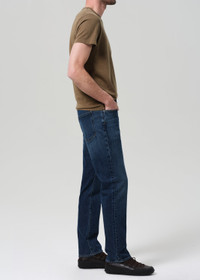 The Elijah is our most relaxed fit—cut straight through the hip and leg for all-day comfort and ease. This pair is made from heavyweight comfort stretch denim with a soft hand. Finished in a rich indigo wash with fading, marbling, and whiskering for a broken-in, lived-in character. If you loved our Sid or Perfect Casual Straight Fit, you will love the Elijah. This fit is true to size. Looks Like: Medium to dark indigo denim Feels Like: Comfort stretch, signature archive denim with a super soft hand for all day wearability DETAILS Closure: Zip Fly Rise: 10 3/4” Inseam: 32” Leg Opening: 16” Model is 6'1" and is wearing a Size 31 Fabric Content: 99% Cotton 1% Elastane Care Instructions: Machine wash cold inside out with like colors. Do not bleach. Tumble dry low. Made in USA with imported materials 6510B-3068_BENNG