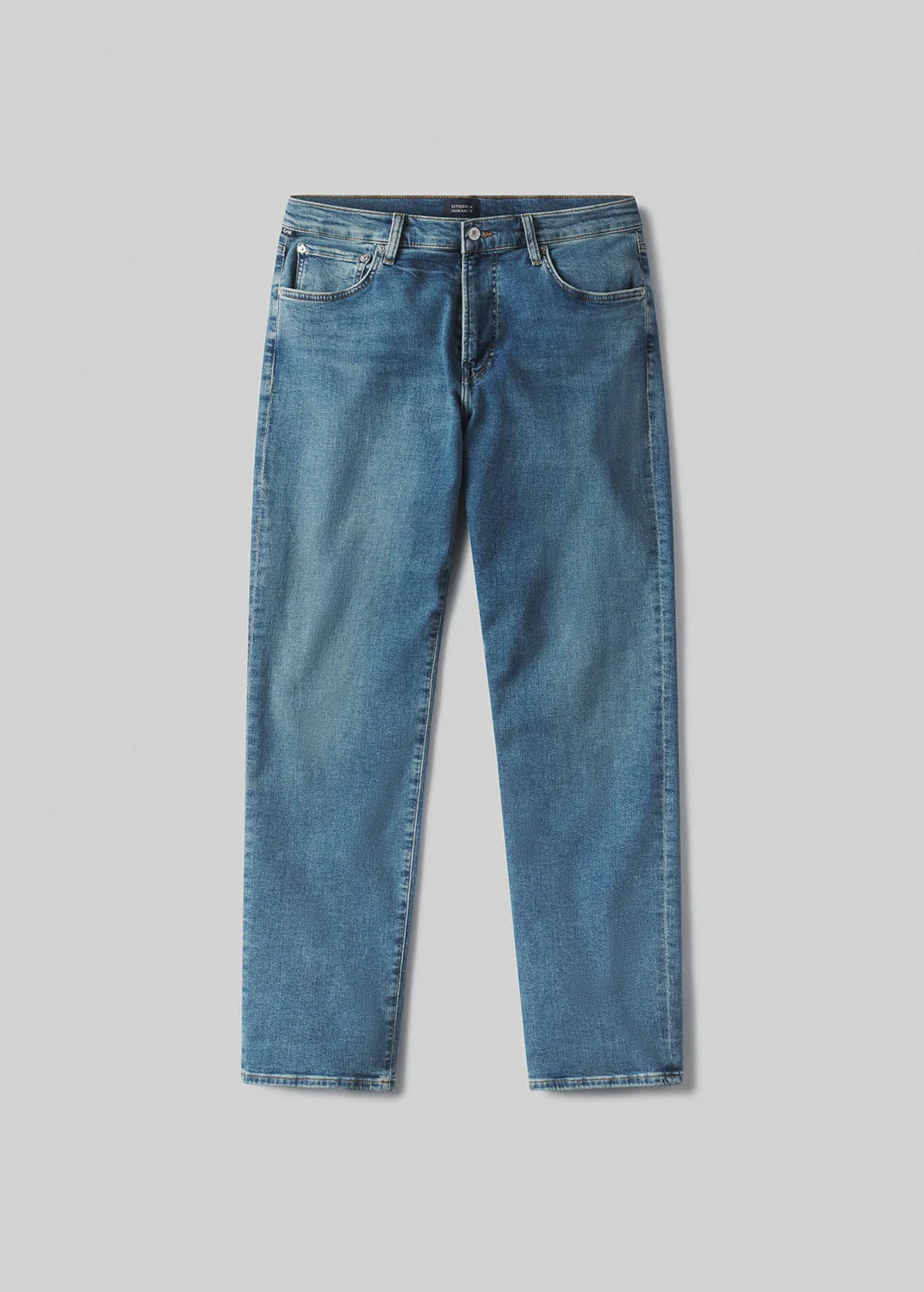 Our most relaxed fit, offering a straight fit throughout the hip and leg. If you loved our Sid or Perfect Casual Straight Fit, you will love the Elijah. This fit is true to size. Looks Like: Medium indigo with slight whiskering and fading Feels Like: Soft, comfort stretch denim with a lightweight feel From our HUMANITY Collection DETAILS Closure: Zip Fly Rise: 10 3/4” Inseam: 32” Leg Opening: 16 1/2” Model is 6'1" and is wearing a size 32 Fabric Content: 98% Cotton 2% Spandex Care Instructions: Machine wash cold inside out with like colors. Do not bleach. Tumble dry low. Made in Turkey with imported materials 6510-1152-PRKLN