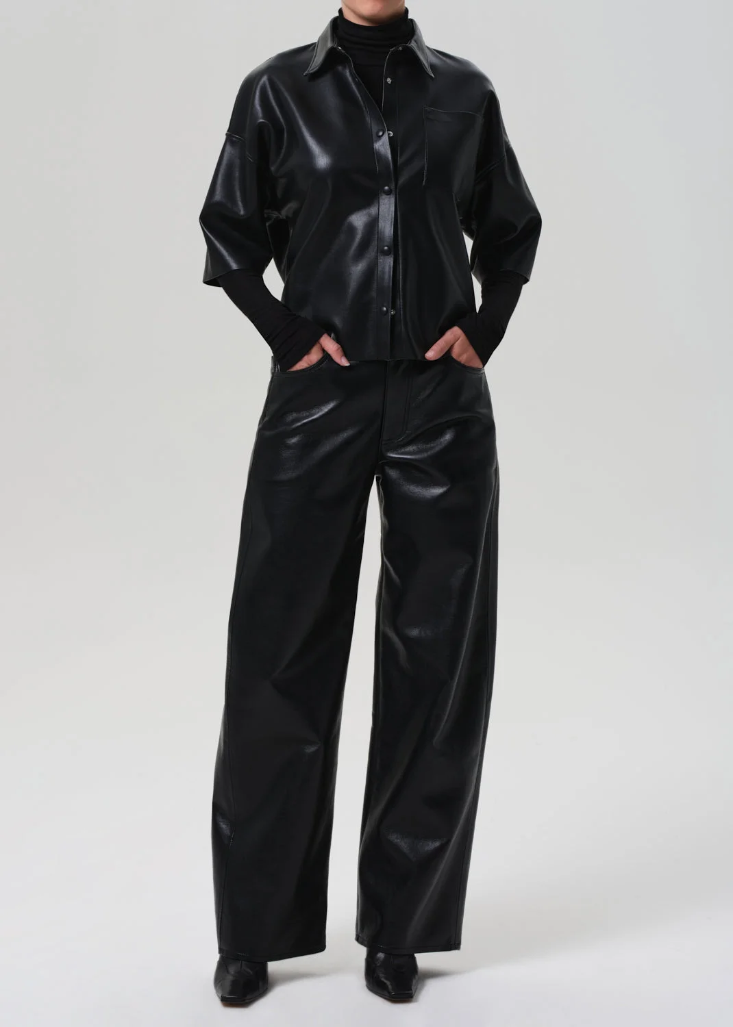 The ‘Frances’ offers a directional take on the classic button-up, reimagined in buttery vegan leather with a subtle stretch for ease. Designed with a cropped silhouette and cape-inspired back detail, it balances sharp structure with modern edge. A bold staple—perfect styled with high-rise denim or tailored trousers. This fit is true to size. Looks Like: B lack vegan leather cropped button front short sleeve shirt Feels Like: Buttery, vegan leather with slight stretch for ease From our HUMANITY Collection DETAILS Body Length: 23 1/4" Chest: 45 1/2" Sleeve Length: 9 1/2" Model is 5'10" and wearing a size Small Fabric Content: 55% Bamboo Viscose 45% Polyurethane Care Instructions: Machine wash cold inside out with like colors. Do not bleach. Tumble dry low. Made in USA with imported materials 9446-3015_BLK