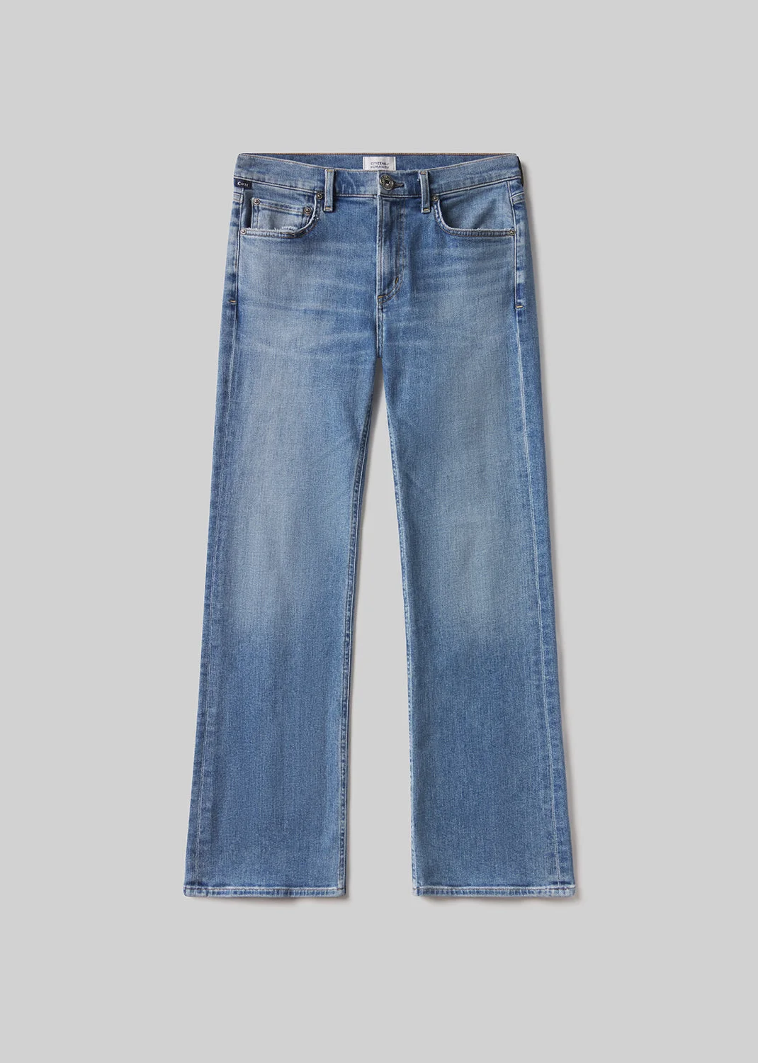 The Genova is a low-slung bootcut crafted from our signature denim, blended with cashmere for an exceptionally soft hand. Sitting naturally on the hips, the silhouette extends into a full-length bootcut that elongates and refines. Finished in a light-to-medium indigo wash, it’s an effortlessly versatile piece that moves with ease from day to evening. This fit is true to size. Looks Like: Light to medium indigo denim pant Feels Like: Signature denim blended with cashmere for a super soft hand From our HUMANITY Collection DETAILS Closure: Zip Fly Inseam: 31 3/4" Leg Opening: 18 1/2" Model is 5'10" and wearing a size 27 Fabric Content: 93% Cotton 5.5% Cashmere 1.5% Elastane Care Instructions: Machine wash cold inside out with like colors. Do not bleach. Tumble dry low. Made in Turkey with imported materials 2195B-1617_SLLA