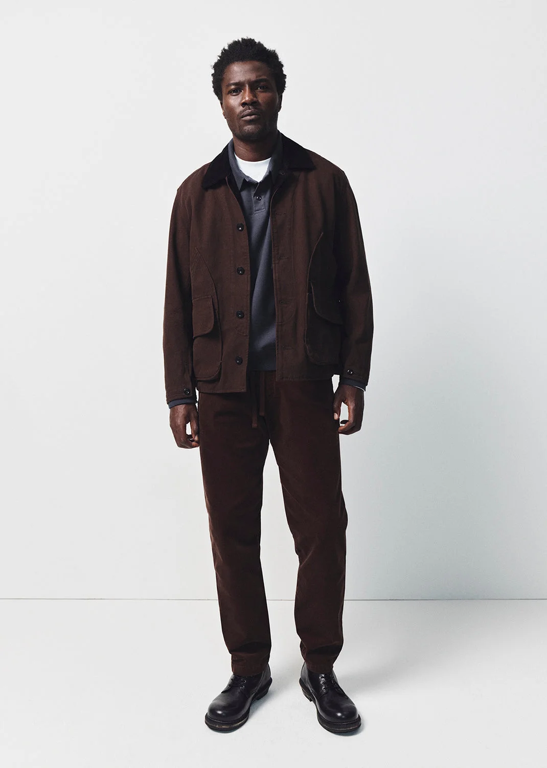 The ‘Hunter’ Jacket is a utilitarian staple reimagined in midweight brushed twill with a durable yet refined finish. Designed with classic pocket detailing and an accented collar, it balances structure with ease. The deep brown hue adds a grounded sophistication—ideal layered over denim or casual tailoring. This fit is true to size. Looks Like: Clean dark brown jacket with front pocket detailing & accented collar Feels Like: Midweight durable brushed twill DETAILS Closure: Button Front Body Length: 27" Chest: 49 1/2" Sleeve Length: 24 3/4" Model is 6'1" and wearing a size Medium Fabric: 100% Cotton Care Instructions: Machine wash cold inside out with like colors. Do not bleach. Tumble dry low. Made in USA with imported materials M558-1878-DBR