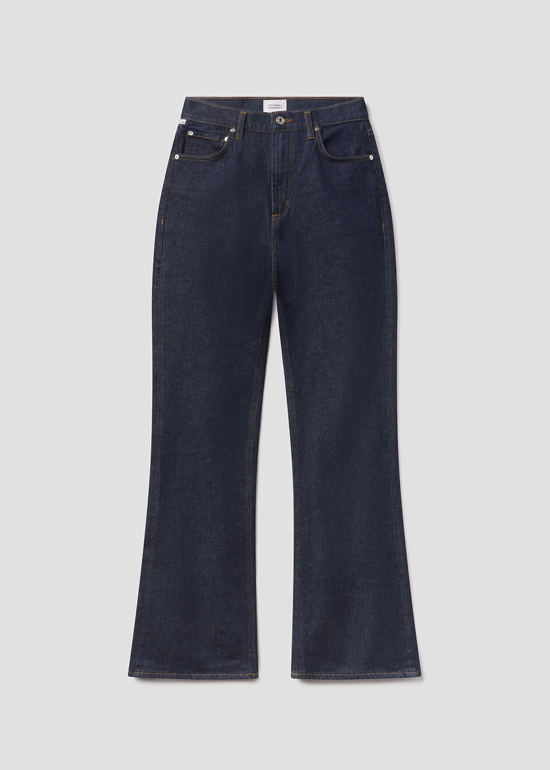 The Kimberly is a high-rise flare inspired by classic '70s silhouettes, designed to elongate the leg and contour the waist. Crafted from comfort stretch denim with a super soft hand, it offers lasting shape and all-day ease. The Helia wash—a clean, dark indigo rinse—adds a polished, versatile finish. Style with slim knits or structured shirting for a clean look. This fit is true to size. Looks Like: Clean dark rinsed out indigo denim pant Feels Like: Comfort stretch, denim with a super soft hand for all day wearability This product is made with regenerative cotton from Citizens of Humanity Group’s Regenerative Cotton Program. Our program collaborates closely with farmers both domestically and internationally, nurturing growth, fostering education, and encouraging the widespread adoption of regenerative agricultural practices. Eco-Indigo is a first-of-its-kind, high-performance textile dye. It transforms renewable resources like sugar through fermentation and green chemistry to create vibrant, lasting COLOR. This groundbreaking process reduces energy consumption, CO₂ emissions, and dependence on fossil fuels, thus help preserving our environment. Now applied to our regenerative cotton denim, Eco-Indigo is coloring the way for a more sustainable future. From our HUMANITY Collection DETAILS Closure: Zip Fly Rise: 11" Inseam: 32" Leg Opening: 24" Model is 5'10" and wearing a size 27 Fabric Content: 99% Regenerative Cotton 1% Elastane Care Instructions: Machine wash cold inside out with like colors. Do not bleach. Tumble dry low. Made in Turkey with imported materials 2245-1854_HELIA