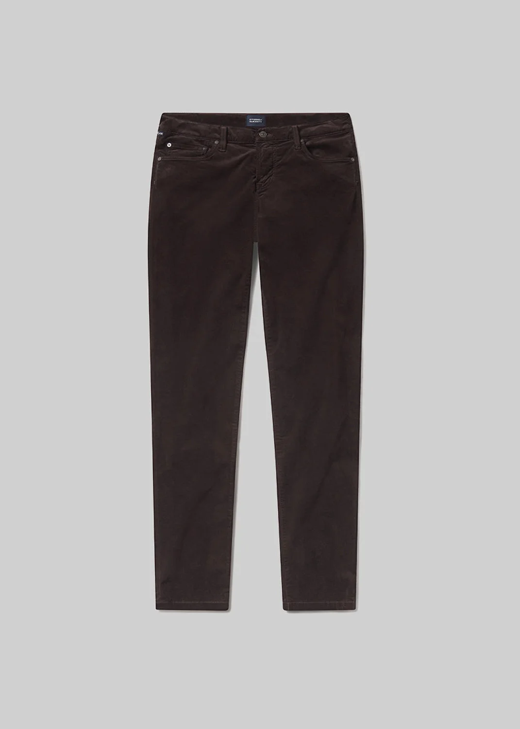 Our trimmest option, tailoring the slim to offer a trimmer look from the knee down while offering room throughout the hip and thigh. This fit is true to size. Looks Like: Clean dark brown Feels Like: Smooth midweight velvet DETAILS Closure: Zip Fly Rise: 10 1/2” Inseam: 32” Leg Opening: 13 1/2” Model is 6'1" and is wearing a size 32 Fabric Content: 53% Cotton 37% Modal 8% Polyester 2% Elastane Care Instructions: Machine wash cold inside out with like colors. Do not bleach. Tumble dry low. Made in USA with imported materials 6170-1710_BSTER