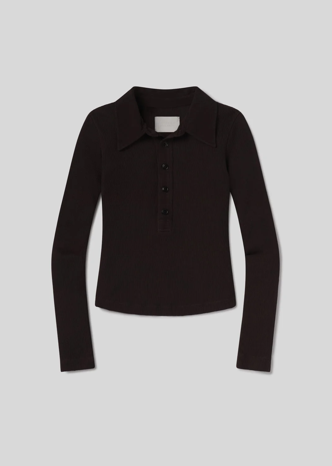 A long-sleeve polo crafted from ultra-soft, supportive ribbed cotton with a comfortable midweight feel. The fit is true to size. Layer under a blazer for a polished look or wear alone with high-rise denim for effortless everyday style. This fit is true to size. Looks Like: Dark brown long sleeve polo Feels Like: Ultra soft and supportive ribbed cotton From our HUMANITY Collection DETAILS Body Length: 22 1/4" Sleeve Length: 24 3/4" Model is 5'10" and is wearing a size Small Fabric Content: 49% Organic Cotton 49% Lyocell 2% Spandex Care Instructions: Machine wash cold inside out with like colors. Do not bleach. Tumble dry low. Made in USA with imported materials 9461-3004_CHOCO