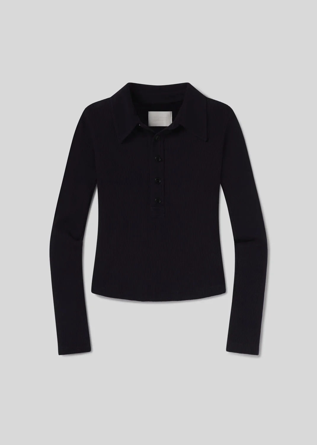 A long-sleeve polo crafted from ultra-soft, supportive ribbed cotton with a comfortable midweight feel. The fit is true to size. Wear alone with high-rise denim for everyday ease or layer under a blazer for a refined look. This fit is true to size. Looks Like: Dark navy long sleeve polo Feels Like: Ultra soft and supportive ribbed cotton From our HUMANITY Collection DETAILS Body Length: 22 1/4" Sleeve Length: 24 3/4" Model is 5'10" and is wearing a size Small Fabric Content: 49% Organic Cotton 49% Lyocell 2% Spandex Care Instructions: Machine wash cold inside out with like colors. Do not bleach. Tumble dry low. Made in USA with imported materials 9461-3004_NVY