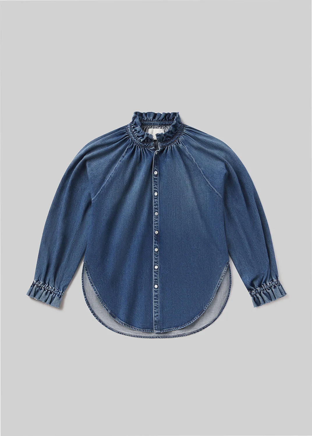 BLOOM, our FW'25 Capsule Collection in collaboration with Moda Operandi, is a celebration of regeneration, craft, and nature’s inherent wisdom. Rooted in the sustainable practices at Bloom Farm, this collection reflects our shared vision for innovative, responsible denim—an approach that begins in the soil and carries through to the pieces you wear every day. A romantic take on a denim shirt, with ruffle detailing at the neck and cuffs, and a dramatic shirt tail hem curve, and delicate shell buttons. Cut in lightweight regeneratively grown cotton indigo, dyed with PILI eco-indigo. This fit is true to size. Looks Like: medium indigo long sleeve denim shirt with ruffle detailing Feels Like: Non-stretch, weightless denim washed down for a super soft feel This product is made with regenerative cotton from Citizens of Humanity Group’s Regenerative Cotton Program. Our program collaborates closely with farmers both domestically and internationally, nurturing growth, fostering education, and encouraging the widespread adoption of regenerative agricultural practices. Eco-Indigo is a first-of-its-kind, high-performance textile dye. It transforms renewable resources like sugar through fermentation and green chemistry to create vibrant, lasting COLOR. This groundbreaking process reduces energy consumption, CO₂ emissions, and dependence on fossil fuels, thus help preserving our environment. Now applied to our regenerative cotton denim, Eco-Indigo is coloring the way for a more sustainable future. DETAILS Body Length: 28 3/4" Chest: 50" Sleeve Length: 27 1/4" Model is 5'10" and wearing a size Small Fabric Content: 100% Regenerative Cotton Care Instructions: Machine wash cold inside out with like colors. Do not bleach. Tumble dry low. Made in the USA 9464-1812_BEACO