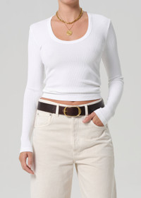 Minimal must-have. The Mara is crafted with the perfect amount of stretch that will hold its shape all day. With a slim-fitting silhouette and layering-friendly sleeves, style under a blazer for the office or wear on its own with your favorite pair of denim. This fit is true to size. Looks Like: Clean white scoop neck fitted long sleeve shirt Feels Like: Rib organic cotton with the softest hand From our HUMANITY Collection DETAILS Body Length: 21 1/2" Sleeve Length: 24 1/2" Model is 5'10" and wearing a size Small Fabric Content: 49% Organic Cotton 49% Tencel 2% Spandex Care Instructions: Machine wash cold inside out with like colors. Do not bleach. Tumble dry low. Made in USA with imported materials 9414-3004_WHT
