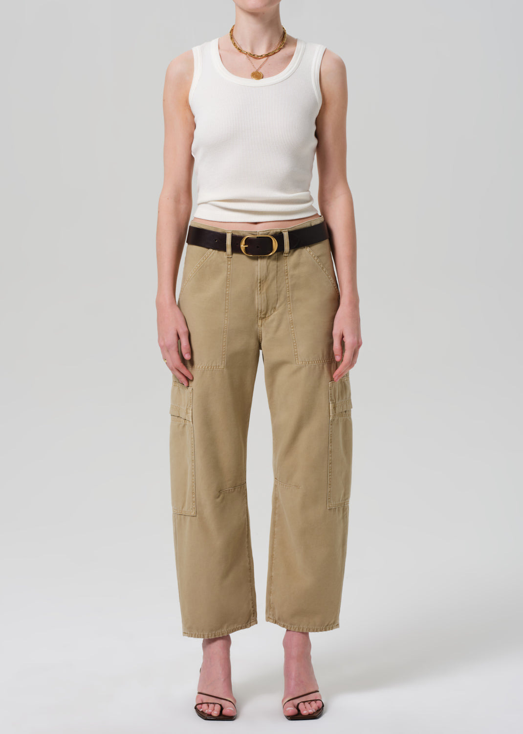 Easy and effortless. Our Marcelle features cargo-inspired detailing and relaxed straight leg that tapers at the ankle. Crafted a breathable but rigid, non-stretch twill for all day wear - style yours back to heels or sneakers. This fit is true to size. Looks Like: Medium beige cargo pant Feels Like: Midweight rigid, non-stretch twill made to hold its shape all day long From our HUMANITY Collection DETAILS Closure: Zip Fly Rise: 11 3/4" Inseam: 27" Leg Opening: 17 1/2" Model is 5'10" and is wearing a Size 27 Fabric Content: 100% Regenerative Cotton Care Instructions: Machine wash cold inside out with like colors. Do not bleach. Tumble dry low. Made in Turkey with imported materials 2078-576_GOBI