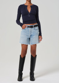 Our signature short now with a longer inseam. The Marlow Long is relaxed mid-rise offering an easy fit with undone edges. Perfect for a getaway or running errands on the weekend. These ultra-comfortable cut-offs can be styled with virtually anything. We like to pair ours with a classic tee or light sweater. This fit is true to size. Looks Like: Light indigo short with raw hem Feels Like: Rigid, non-stretch regenerative cotton with a soft hand feel From our HUMANITY Collection DETAILS Closure: Button Fly Rise: 12" Inseam: 6 1/2" Leg Opening: 23 3/4" Model is 5'10 and wearing a size 27 Fabric Content: 100% Regenerative cotton Care Instructions: Machine wash cold inside out with like colors. Do not bleach. Tumble dry low. Made in Turkey with imported materials 2080G-3011_RLEIG