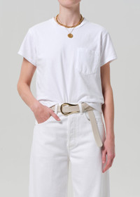 A wardrobe essential, refined. The Maybelle Pocket Tee, crafted from 100% regenerative cotton, is a classic white tee reimagined with effortless style and everyday wearability. Featuring a subtle chest pocket and a clean, timeless design, it pairs seamlessly with denim or layering pieces. Simple yet elevated, this essential brings both comfort and versatility to your wardrobe. This fit is true to size. The Citizens of Humanity x Argent collection unites two brands driven by a shared commitment to responsible design, sustainability, and empowering women. Crafted for a modern wardrobe that transitions seamlessly from work to life, the collection features elevated, versatile pieces made with sustainable materials such as regenerative cotton and bio indigo dye. More than clothing, this collaboration is a call to action—championing values that matter and inspiring women to advocate for a more sustainable future. This product is made with regenerative cotton from Citizens of Humanity Group’s Regenerative Cotton Program. Our program collaborates closely with farmers both domestically and internationally, nurturing growth, fostering education, and encouraging the widespread adoption of regenerative agricultural practices. DETAILS Chest: 42 1/2” Fabric Content: 100% Regenerative cotton Care Instructions: Machine wash cold with like colors, inside out. do not bleach, tumble dry low, iron medium if necessary. Made in USA with imported materials 9432-3061_WHT