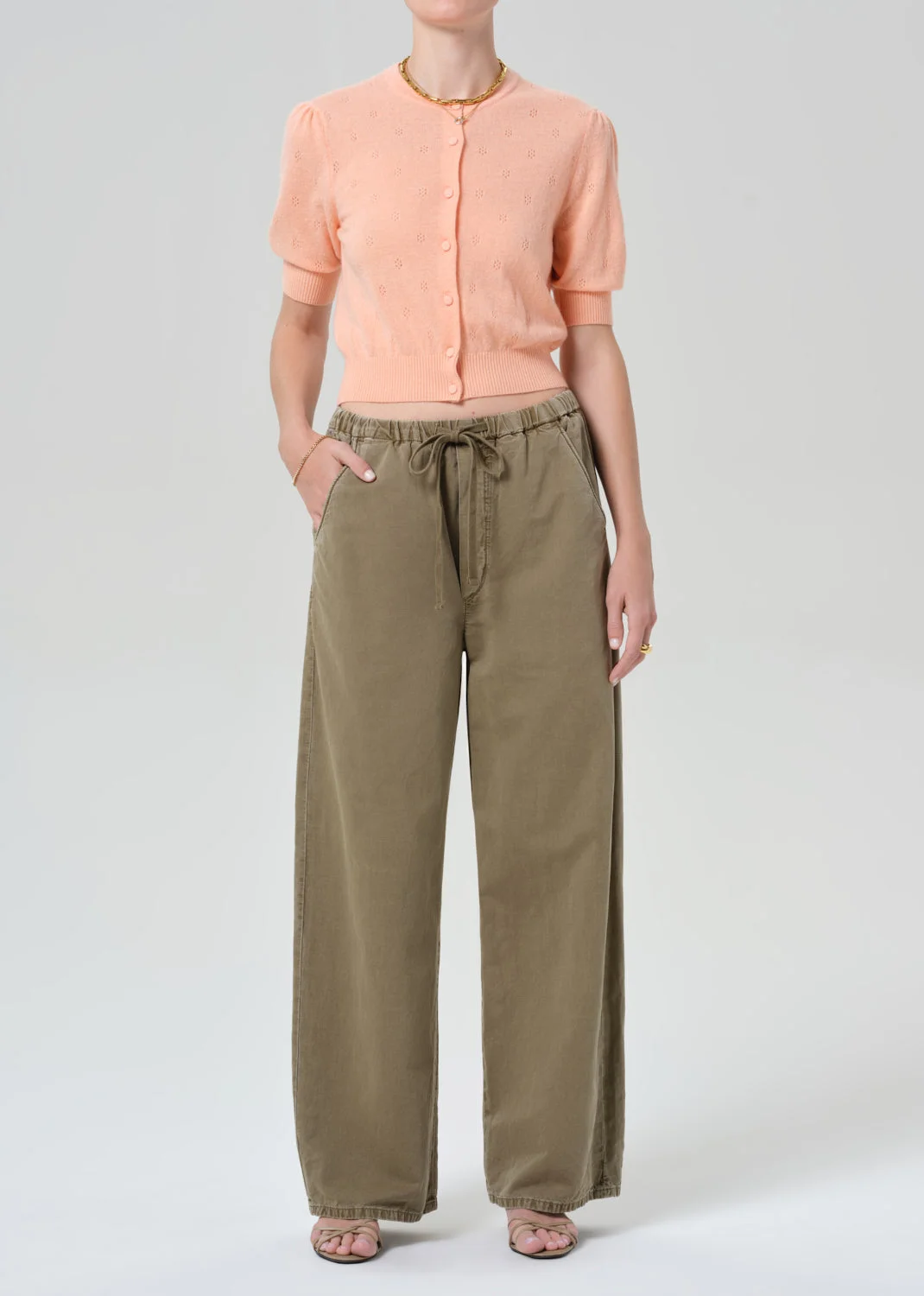 The Raina Pointelle Short Sleeve Cardigan is a modern classic with a softly structured silhouette and delicate pointelle detailing. Knit from a luxurious blend of natural wool and ultra-fine cashmere, it’s exceptionally soft, breathable, and lightweight. Refined yet relaxed, it’s the perfect layering piece for year-round wear. This fit is true to size. Looks Like: Medium to light orange short sleeve puff sleeve cardigan Feels Like: A mix of natural wool fibers and ultra fine cashmere, giving a breathable and soft hand feel From our HUMANITY Collection DETAILS Body Length: 20" Chest: 35 1/2" Sleeve Length: 11 3/4" Model is 5'10" and is wearing a size Small Fabric Content: 57% Wool 43% Cashmere Care Instructions: Dry clean only. Made in Bulgaria with imported materials 5186_CRMSI