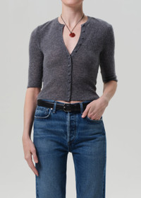 The ‘Tabitha’ is a slim-fitting cardigan knit from a breathable blend of wool and ultra-fine cashmere. Designed with cropped elbow sleeves and a close silhouette, it layers cleanly or wears well on its own—an elevated staple with timeless appeal. This fit is true to size. Looks Like: Dark heathered grey elbow sleeve fitted cardigan Feels Like: A mix of natural wool fibers and ultra fine cashmere, giving a breathable and soft hand feel From our HUMANITY Collection DETAILS Body Length: 20 1/4" Sleeve Length: 12 1/4" Model is 5'10" and is wearing a size Small Fabric Content: 50% Wool 40% Cashmere 10% Solvrone Nobel Care Instructions: Dry clean only. Made in Bulgaria with imported materials 5165_TORRO