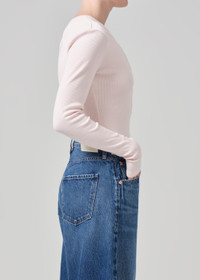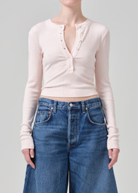 Designed from a form-fitting rib, this versatile henley can be worn fully buttoned or undone for a more relaxed look. This fit is true to size. Looks Like: Light baby pink Feels Like: Ultra-soft, ultra-supportive organic cotton rib with a hint of stretch that holds the body From our HUMANITY Collection DETAILS Body Length: 21 1/2" Sleeve Length: 24 1/2" Model is 5'10" and wearing a size Small Fabric Content: 49% Organic Cotton 49% Tencel Lyocell 2% Spandex Care Instructions: Machine wash cold inside out with like colors. Do not bleach. Tumble dry low. Made in USA with imported materials 9400-3004_CMEO