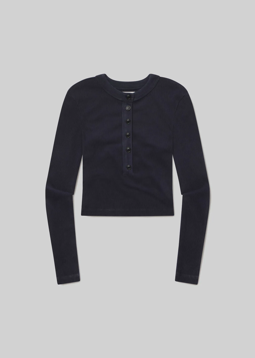 Designed from a form-fitting rib, this versatile henley can be worn fully buttoned or undone for a more relaxed look. This fit is true to size. Looks Like: Dark navy mineral dyed fitted long sleeve henley Feels Like: Rib organic cotton with the softest hand From our HUMANITY Collection DETAILS Body Length: 21 1/2" Sleeve Length: 24 1/2" Model is 5'10" and wearing a size Small Fabric Content: 49% Organic Cotton 49% Tencel Lyocell 2%Spandex Care Instructions: Machine wash cold inside out with like colors. Do not bleach. Tumble dry low. Made in USA with imported materials 9400B-3004_MNRNV