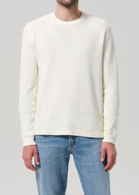 The ‘Waffle Crewneck’ is a cold-weather essential, crafted from a textured midweight thermal inspired by vintage military layers. Designed for a close yet comfortable fit, the long sleeve silhouette is easy to wear on its own or under outerwear. A refined update to the classic base layer. This fit is true to size. Looks Like: Light off white long sleeve crewneck with a subtle grey undertone Feels Like: Textured midweight military thermal DETAILS Body Length: 26 1/2" Sleeve Length: 25" Model is 6'2 and wearing a size Medium Fabric Content: 100% Cotton Care Instructions: Machine wash cold inside out with like colors. Do not bleach. Tumble dry low. Made in USA with imported materials MT134-1798_CVAS